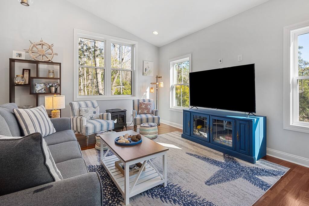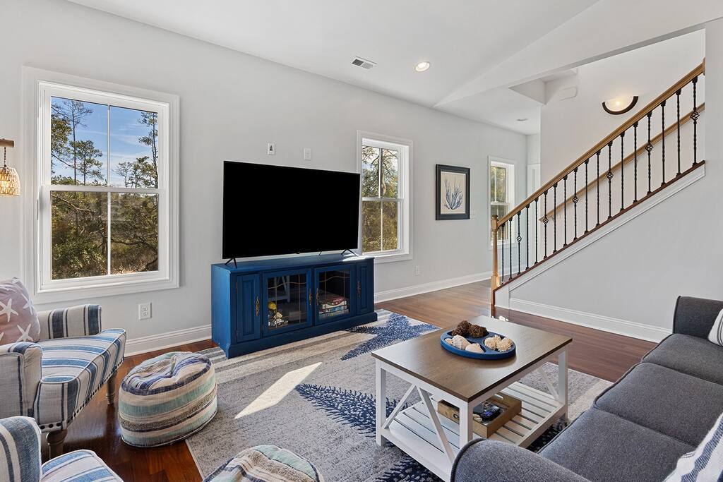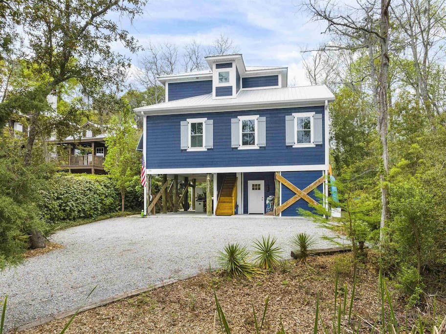 Escape to this stunning 4-bedroom, 3.5-bath raised beach house, tucked away on a quiet street with marsh views of historic Pawleys Island. With 2308 sq. ft. of privacy nestled in natural wooded surroundings, this home is the perfect retreat for your next vacation. Inside, you’ll find Brazilian Teak tongue & groove floors throughout and a modern gourmet kitchen with high-grade stainless appliances. The house, built in 2017, has an abundance of windows for tons of natural light. There are five beds total: 2 kings, 2 queens, and a futon in the office space. The primary bedroom has a king bed with an en-suite bathroom. The second king room and one of the queen rooms are also upstairs and share an additional full bathroom. The fourth bedroom is in the studio apartment and features a queen sized bed, a full bathroom, a kitchen, and dining and living area.